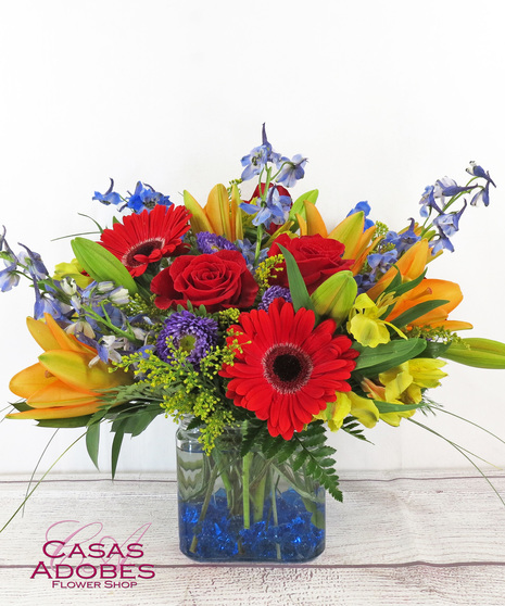 The exciting bouquet includes orange lilies, red gerbera daisies, purple Matsumoto asters, red roses and yellow alstroemeria accented with fresh greenery in a trendy vase with blue gems.Perfectly bold & bright for a congratulation gift, birthdays, get well and any occasion.
