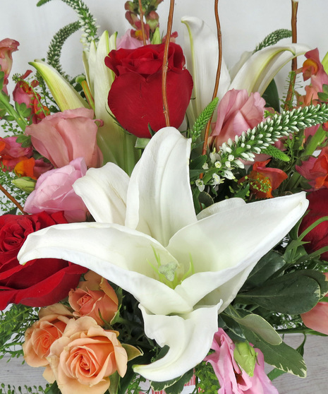 We’ve paired elegant white lilies with classic red roses, peach spray roses for a look that is both soft and edgy with pink lisianthus and snapdragons in a red-and-white checkered vase, detailed with tiny red hearts.