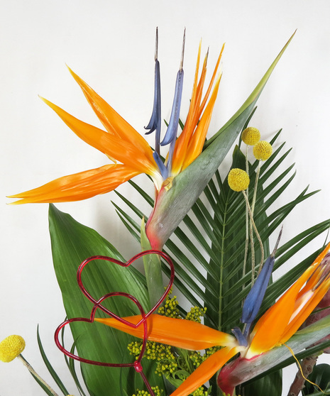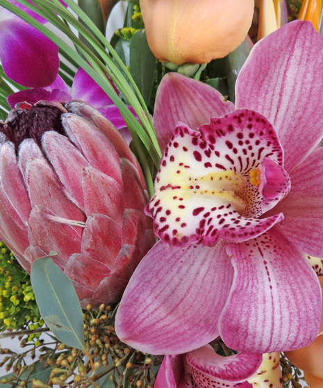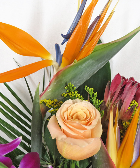 Give the gift of the tropics this Valentine's Day. This bold arrangement features dramatic Bird of Paradise and sophisticated, deep magenta cymbidium orchids, pink protea, and soft peach roses. The perfect, unforgettable gift for a loved one who deserves something vibrant and exceptional.