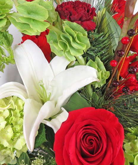 The bouquet includes white lilies, white hydrangea, red roses, red gladiolas,  and a mix of holiday pine, rich red bow and berries in a beautiful glass vase.
