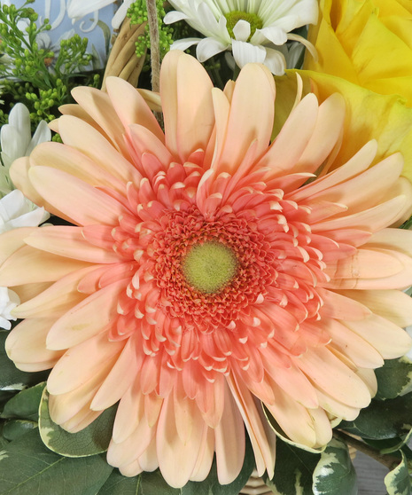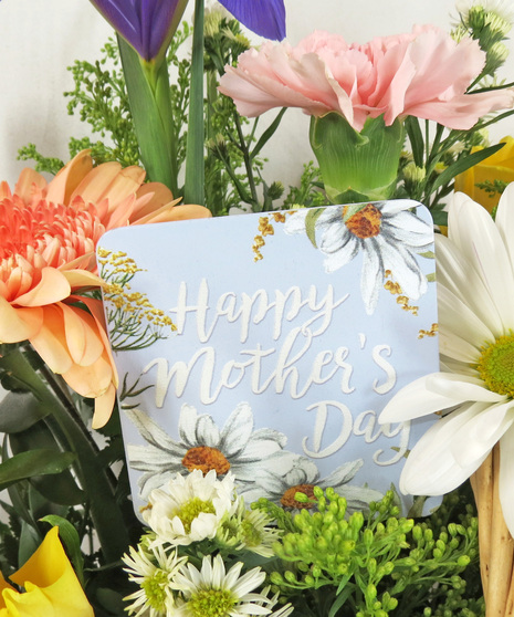 Bring the beauty of a blooming spring meadow right to her doorstep with this charming basket arrangement. Overflowing with texture and soft, sun-drenched colors, it’s a timeless way to say "thank you" this Mother’s Day. Featuring blue iris, peach gerbera daisies and yellow roses, white daisies, craspedia, and greenery in a woven basket. It is perfect for the mom who loves traditional charm with a touch of whimsy. This low-profile, sturdy arrangement is ideal for a breakfast-in-bed tray, a kitchen island, or a sunny windowsill.