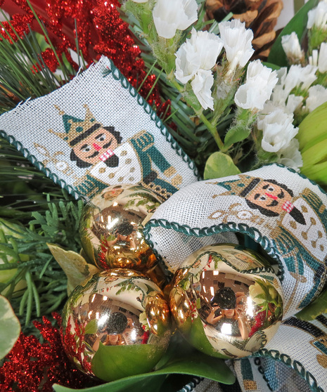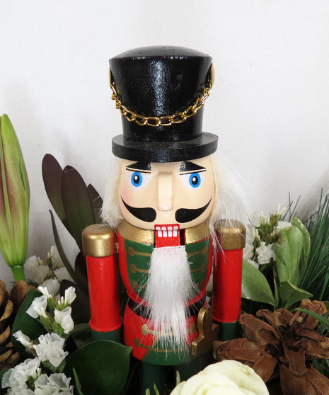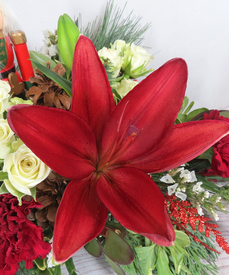 Bring the magic of the holiday season to your table with this captivating arrangement. Featuring a classic wooden Nutcracker soldier standing guard among a rich bed of deep crimson lilies, creamy white roses, and luscious winter greens. Accented with festive ribbons, pinecones, and glittering gold ornaments, it’s the perfect centerpiece to inspire your Christmas festivities. A true showstopper for your holiday dinner table or mantel.
