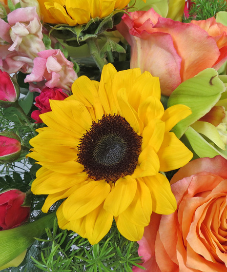Give her a gift that reflects her warmth and energy. Our Sunkissed bouquet is a breathtaking fusion of sun-drenched color and texture. Designed to make a statement, this arrangement features sunflowers, roses, cymbidium orchids, snapdragons and foxtail fern.