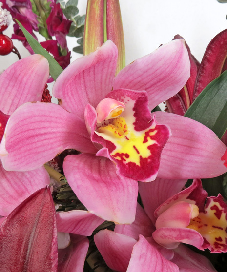 Indulge in the splendor of our Velvet Noel Bouquet, an exquisite arrangement designed to bring warmth and elegance to the festive season. This opulent creation features a striking mix of orchids, deep red roses, lilies, and accented with vibrant berries, pine cones, and sparkling ornaments.