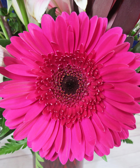 Nestled in a tall, sleek crimson glass vase, this design balances bold architectural lines with soft, romantic blooms. We’ve curated a rich palette of deep reds, electric blues, and striking magentas, featuring: red roses, magenta gerbea daisies, stargazer lilies, blue delphinium, and purple & white calla lilies.