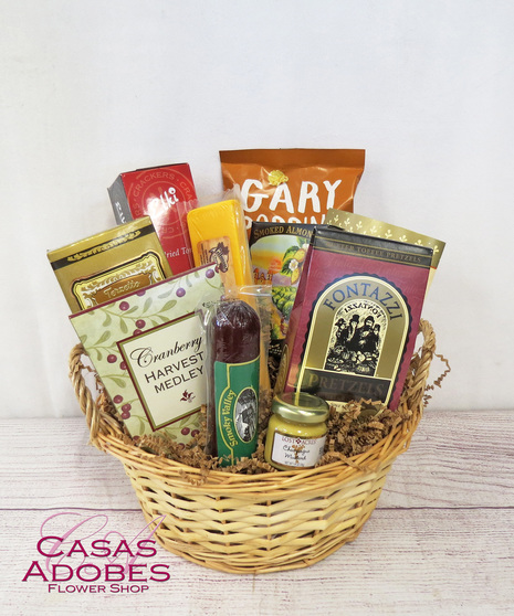 A delicious choice! Send a gift basket of gourmet treats for an instant pick-me-up, any day of the week. This basket of summer sausage, assorted gourmet cheeses, mustard, pretzels, nuts and crackers is always apropos. Great for Birthdays, Get well Gifts, or a gift for Father's Day!