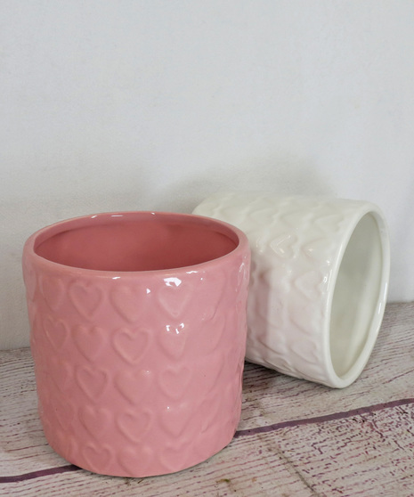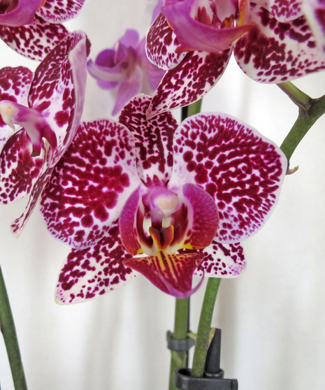 One orchid stands tall in a regal, velvety purple, while its companion boasts striking magenta speckles. This pair is nestled in a festive, ruby-red ceramic planter embossed with delicate hearts and accented with a playful, heart-patterned pinwheel.