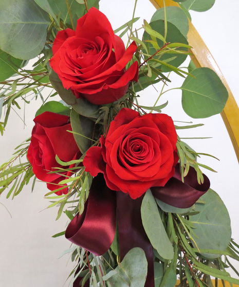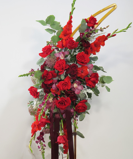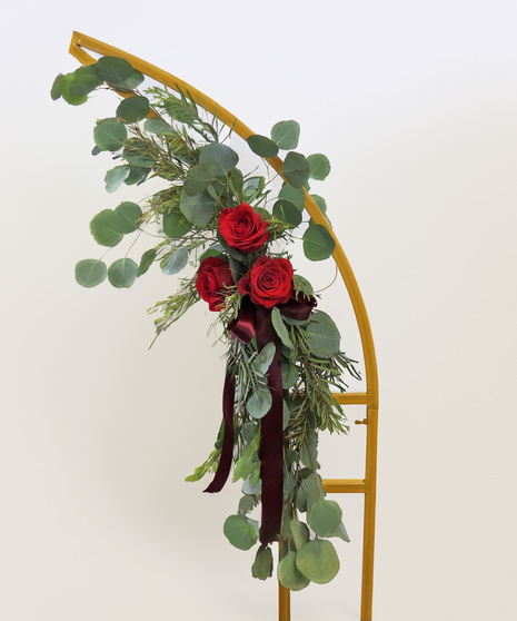Make a bold, unforgettable statement on your wedding day with a breathtaking pair of asymmetrical golden arches adorned with a lavish cascade of rich florals with a symphony in red. The arrangement is dominated by exquisite deep crimson roses and gladioli, burgundy cymbidium orchids, Queen Anne's lace, fragrant eucalyptus and coordinating ribbon.