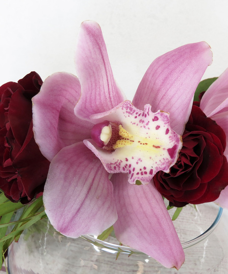 This flower crown is designed with lush burgundy spray roses, burgundy cymbidium orchid blooms, seasonal greenery, and a coordinating ribbons.