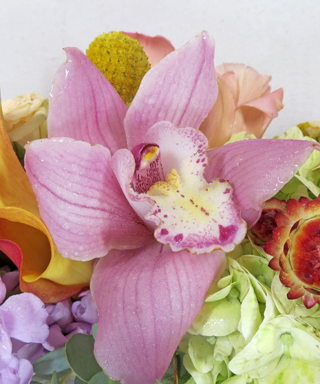 Embrace the joy of a midsummer garden with this breathtakingly vibrant and textural bouquet featuring hydrangea, pink garden roses, cymbidium orchid blooms, pink lisianthus, stock, strawflower, chamomile designed beautifully, reflecting a relaxed, yet sophisticated aesthetic.